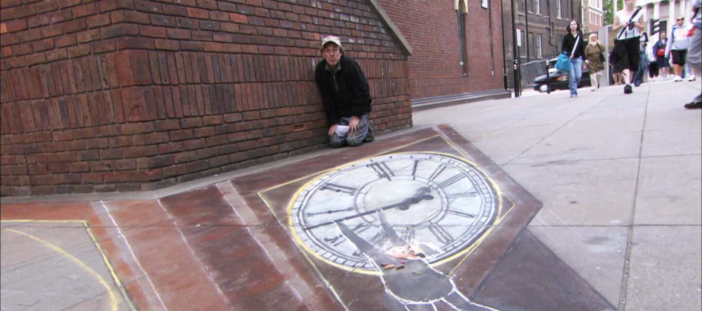 Street artist Julian Beever travels to London where he dazzles onlookers with a chalk drawing of Big Ben that will traverse not only the sidewalk, but also an adjacent wall.