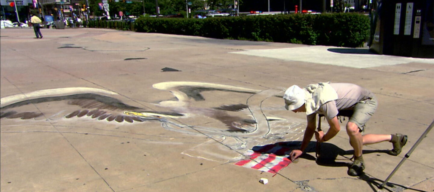 Concrete Canvas S01 E01Street artist Julian Beever travels to Philadelphia, where he creates a three-dimensional anamorphic chalk drawing in tribute to the patriotic American Eagle.